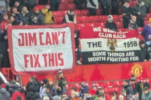 现场的曼联球迷打出了两面横幅,其一是“吉米(拉特克利夫的名字)解决不了这个”,另一面横幅则写着“我们想要回我们的俱乐部。1958。有些事是值得为之奋战的。”