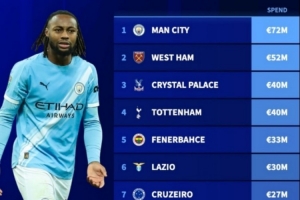 德转列冬窗目前花费榜:曼城7200万欧居首,前四均为英超球队