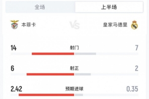 上一篇: 本菲卡2-1皇马半场数据:射门14-7射正6-2,控球率37%-63%